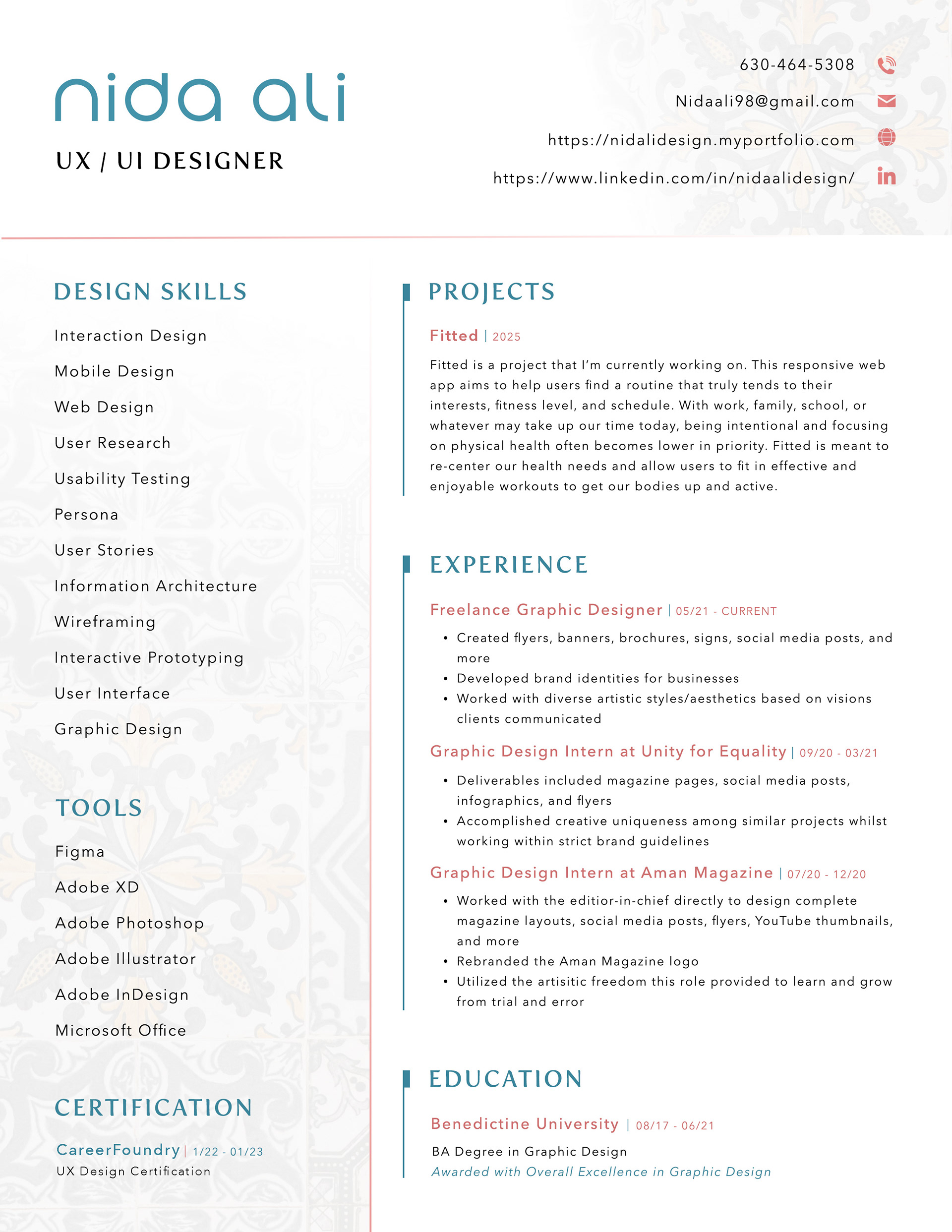 In January 2023, I received my UX design certification. I fell in love with the subject my senior year in college. Though I enjoy my current work, I believe I could use the skills I've learned on a more complex basis. I'm ready to branch out to another stage whilst I continue to utilize my graphic design knowledge.